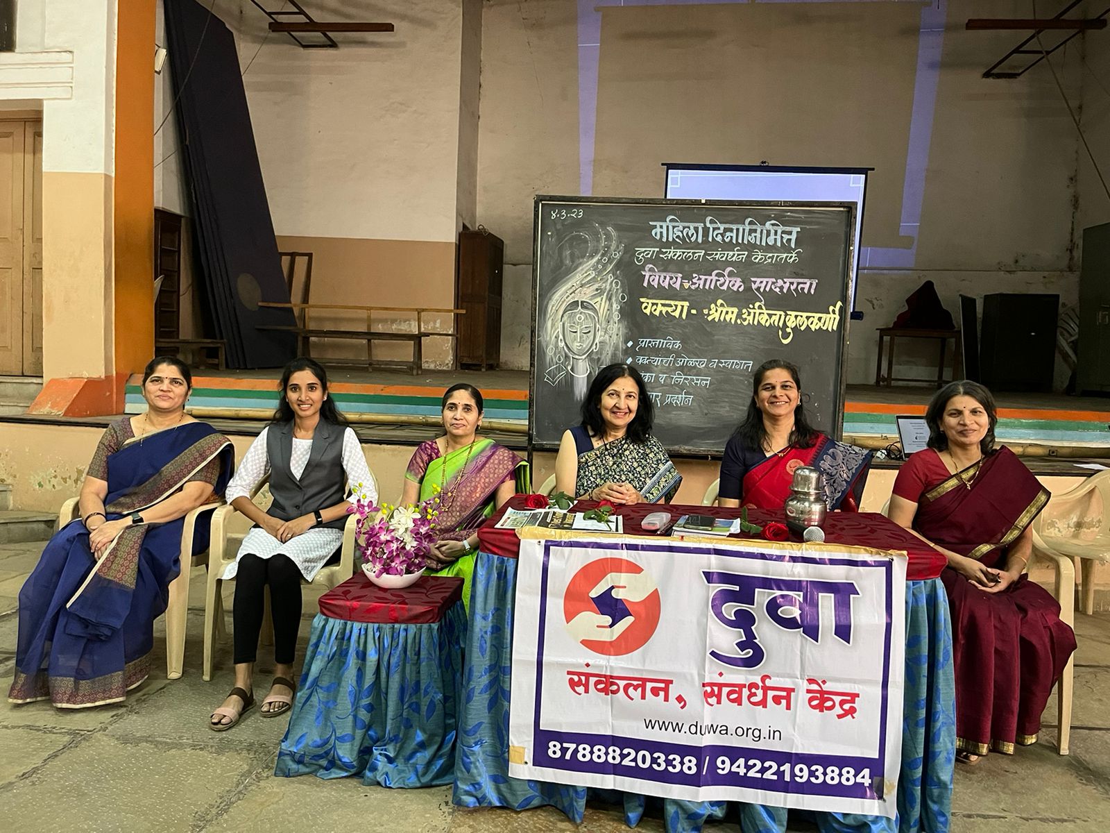 महिला नुसत्या कमावत्या होऊन उपयोगी नाही तर कमावलेल्या पैशाचं नियोजनही स्वतः करण्यास सक्षम झाल्या पाहिजेत. या उद्देशाने महिला दिनाच्या निमित्ताने यंदा ‘दुवा’ संकलन संवर्धन केंद्रातर्फे ‘आर्थिक साक्षरता’ या विषयावर अहिल्यादेवी शाळेतील शिक्षिकांसाठी, अहिल्यादेवी शाळेच्या सभागृहात श्रीमती अंकिता कुलकर्णी यांचे मार्गदर्शन आयोजित केले होते.