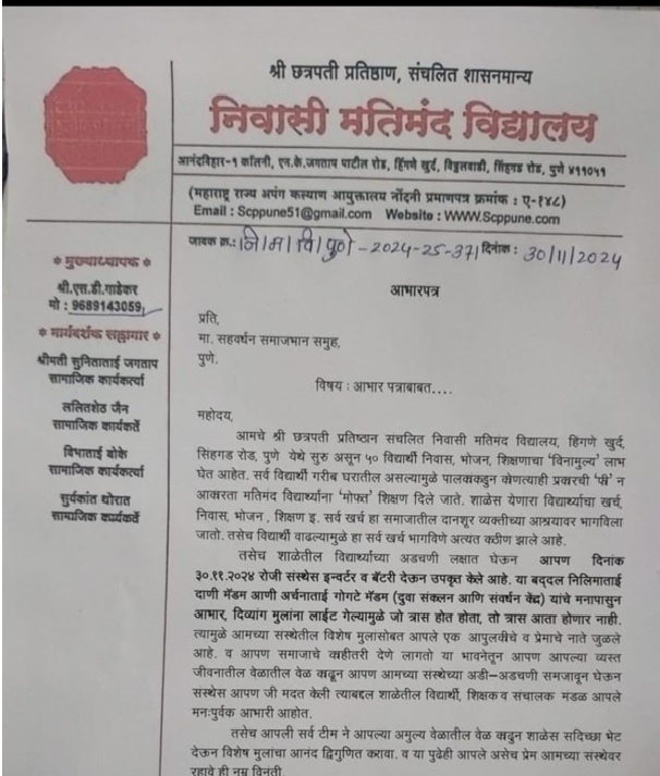 दुवा ने मतिमंद मुलांच्या निवासी शाळेला दिली २४ तास विद्युत प्रवाहाची हमी! या शाळेला inverter च्या दोन batteries "दुवा" तर्फे देण्यात आल्या.