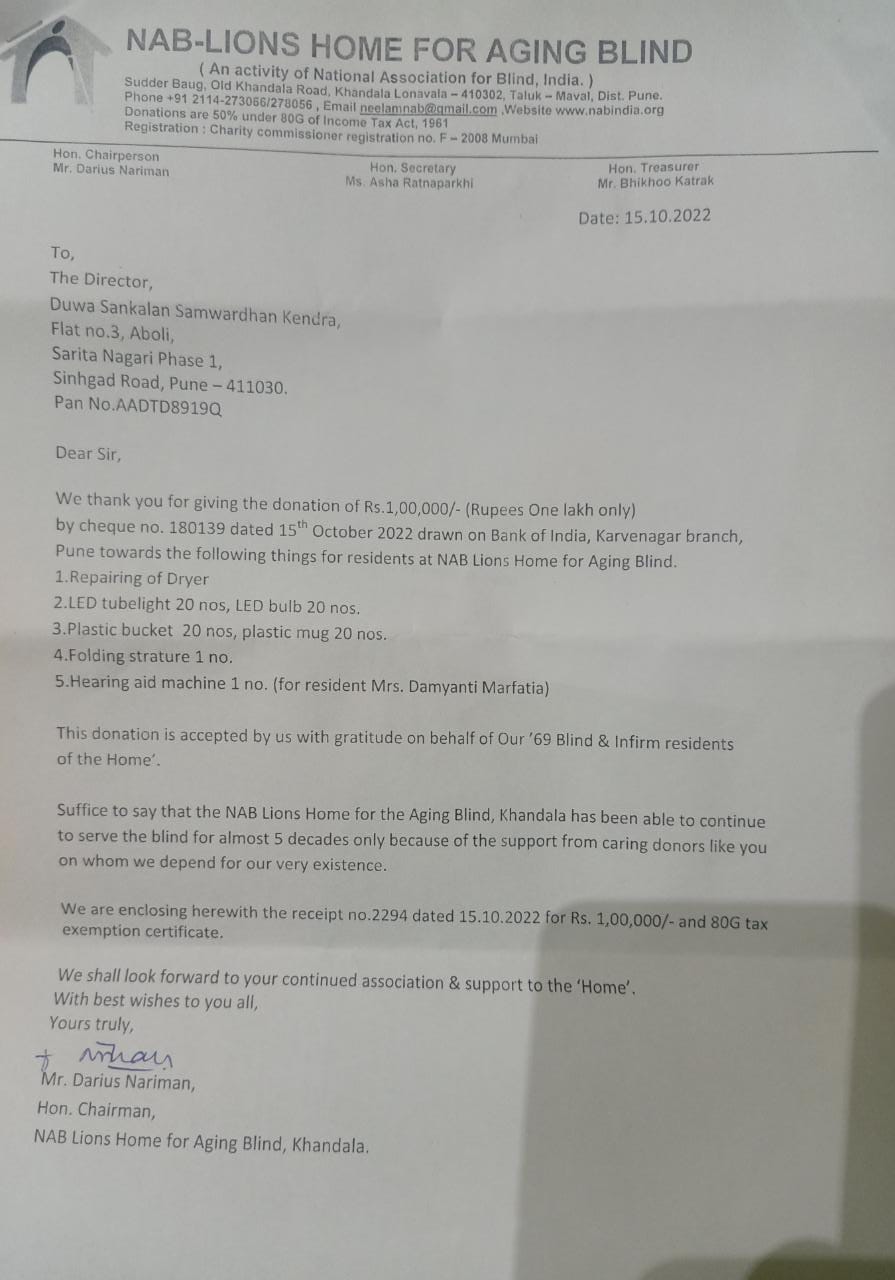 समाजभान समूहाच्या माध्यमातून खंडाळा येथील अंध वृध्द लोकासाठीच्या आश्रमाला दुवा संकलन संवर्धन केंद्रातर्फे १५ ऑक्टोबर रोजी एक लाख रुपयाची देणगी देण्यात आली.