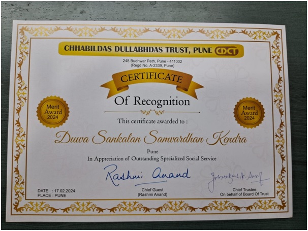 दुवा संकलन, संवर्धन केंद्राच्या मुकुटात मानाचा तुरा! छबिलदासट्रस्टकडून दुवाला 11000 रुपये रोख, मानचिन्ह आणि प्रशस्तिपत्रक देऊन गौरविण्यात आले.
