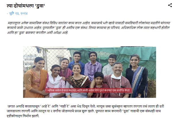 २३ जुलै २०२४ रोजी महाराष्ट्र टाइएम्स चे माजी संपादक अशोक पानवलकर यांचा दुवाच्या कार्याचा आढावा घेणारा लेख प्रसिद्ध झाला. या लेखा मध्ये दुवाच्या कार्याचा सविस्तर आढावा घेऊन दुवा बद्दल गौरव उद्गार काढले आहेत.