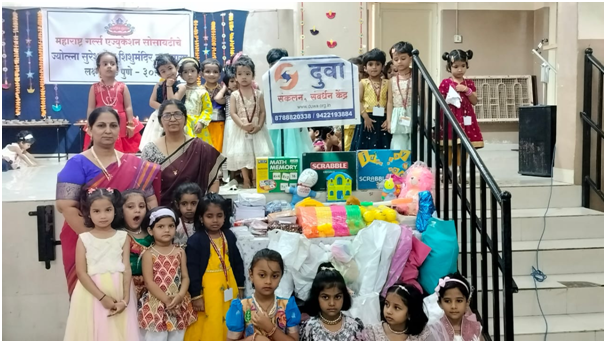 स्टेशनरी आणि खेळणी गरजू मुलांना दिवाळी निमित्त भेट देण्याकरता पूर्व प्राथमिक शाळेमधल्या छोट्या मुलींनी या वस्तू गोळा करून दुवा कडे सुपूर्त केल्या.